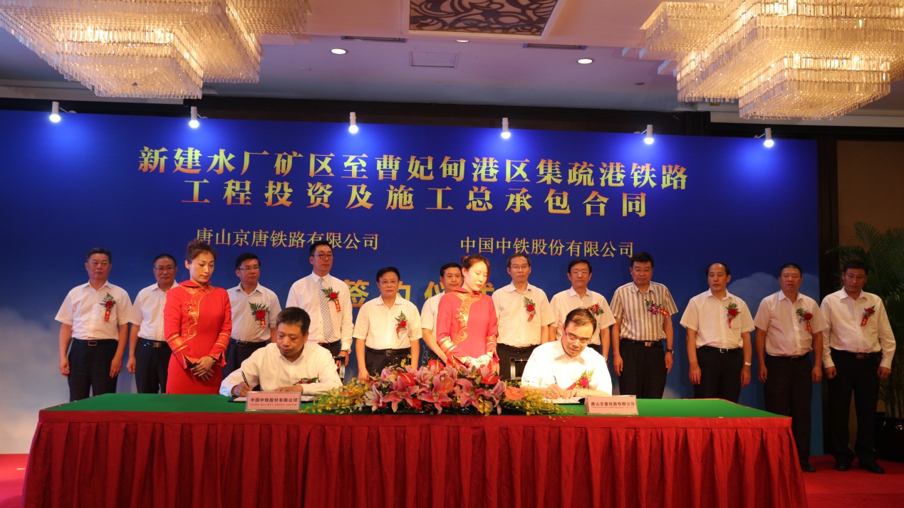 7月11日,新建水廠礦區(qū)至曹妃甸港區(qū)集疏港鐵路工程(簡稱水曹鐵路)投資及施工總承包合同簽約儀式在北京隆重舉行。中國中鐵股份有限公司董事長、黨委書記李長進(jìn),唐山京唐鐵路有限公司總經(jīng)理王建民,中國首鋼集團(tuán)黨委常委、副董事長、總經(jīng)理張功焰,秦皇島港股份有限公司總經(jīng)理田云山,唐山市委常委、常務(wù)副市長王久宗等領(lǐng)導(dǎo)出席簽約儀式并致辭。唐山京唐鐵路有限公司董事長馮國慶主持簽約儀式。王建民總經(jīng)理與周孟波副總裁分別代表唐山京唐鐵路有限公司和中國中鐵股份有限公司簽訂合同。中鐵咨詢總經(jīng)理李壽兵,副總經(jīng)理顏廷祥、張振興出席儀式。