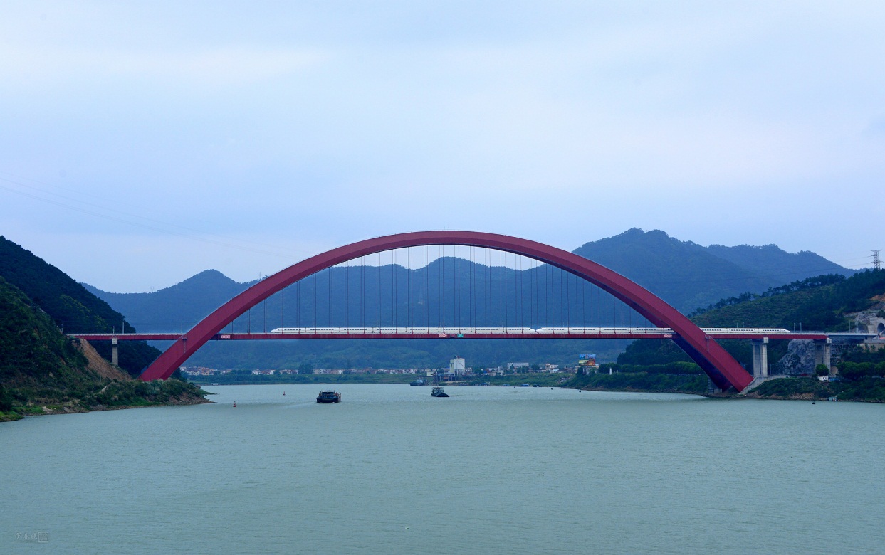 主跨450m的南廣鐵路西江特大橋是世界上最大跨度的高速鐵路鋼箱拱橋,設(shè)計(jì)中對(duì)“邊段豎轉(zhuǎn)+中段提升”、“纜索吊機(jī)節(jié)段懸拼”總體施工方案進(jìn)行了研究,結(jié)合“前臨西江,后靠陡峭山坡”的基礎(chǔ)工程特點(diǎn)提出了可承擔(dān)巨大水平力的新型基礎(chǔ)結(jié)構(gòu)形式和計(jì)算分析方法,解決了大跨度拱橋溫度變形大帶來的軌道鋪設(shè)精調(diào)和高速動(dòng)車組運(yùn)營(yíng)性能評(píng)判的技術(shù)難題,總體技術(shù)成果達(dá)到國(guó)際領(lǐng)先水平,獲國(guó)家發(fā)明專利,2016年榮獲“中國(guó)鋼結(jié)構(gòu)工程大獎(jiǎng)”。