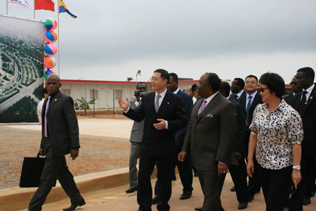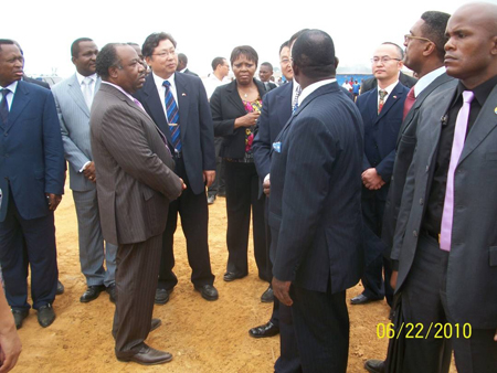 當?shù)貢r間2010年6月22日上午11:00,加蓬共和國總統(tǒng)阿里•邦戈到訪我援建加蓬體育場工地,阿里•邦戈總統(tǒng)首先聽取了中方有關(guān)單位人員的工程進度匯報,然后在我駐加使館李富順大使和胡平參贊的陪同下參觀了施工現(xiàn)場。參觀過程中,阿里•邦戈總統(tǒng)對我援助加蓬體育場的優(yōu)質(zhì)設計和施工進度非常滿意,同時對中方大力支持加方承辦2012年非洲杯足球賽,并為加蓬設計了一座現(xiàn)代化的體育場表示感謝。他離開時表示今年年底還會再來參觀。