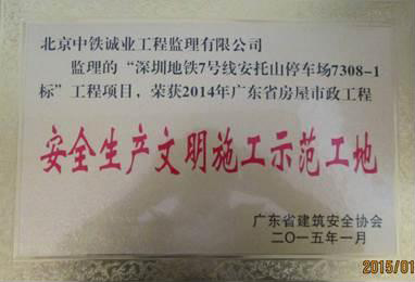近日,中鐵誠業(yè)監(jiān)理公司深圳地鐵7號線項目部榮獲“2014年下半年廣東省建筑安全協(xié)會雙A級安全文明標(biāo)準(zhǔn)化工地和安全生產(chǎn)文明施工示范基地”榮譽(yù)稱號,受到廣東省建筑安全協(xié)會通報表彰。中鐵誠業(yè)監(jiān)理公司在深圳地鐵7號線7208標(biāo)中被深圳地鐵公司授予“優(yōu)勝單位”稱號,在7208監(jiān)理部內(nèi)張占彪榮獲“優(yōu)秀總監(jiān)理工程師”稱號,樊立魏、孟繁玉、李福建榮獲2014年深圳地鐵7號線“優(yōu)秀監(jiān)理工程師”稱號。