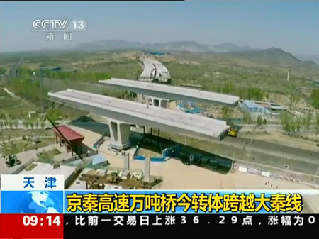 4月16日上午10時(shí),集團(tuán)公司橋梁院設(shè)計(jì)的京秦高速公路跨大秦鐵路分離式立交橋成功轉(zhuǎn)體就位。該橋采用雙幅同步轉(zhuǎn)體62度跨越大秦鐵路,單幅轉(zhuǎn)體重量9600噸,單幅轉(zhuǎn)體長度60+60米。中央電視臺(tái)、天津電視臺(tái)等多家主流媒體對(duì)轉(zhuǎn)體現(xiàn)場進(jìn)行了報(bào)道。