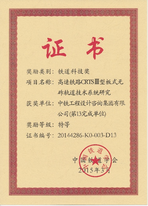 據(jù)《中國鐵道學(xué)會關(guān)于公布2014年度中國鐵道學(xué)會科學(xué)技術(shù)獎獲獎項目的通知》(學(xué)秘(2015)5號)文獲悉,中鐵工程設(shè)計咨詢集團有限公司軌道院參選的《高速鐵路CRTSIII型板式無砟軌道技術(shù)系統(tǒng)研究》項目獲中國鐵道科學(xué)技術(shù)獎特等獎、航遙院參選的《京滬高速鐵路線路綜合維修技術(shù)研究》項目獲中國鐵道科學(xué)技術(shù)獎一等獎、橋梁院參選的《鐵路橋梁球型支座》項目獲中國鐵道科學(xué)技術(shù)獎二等、軌道院參選的《高速道岔和鋼軌伸縮調(diào)節(jié)器應(yīng)急處置技術(shù)及裝備研究》項目獲中國鐵道科學(xué)技術(shù)獎三等獎。