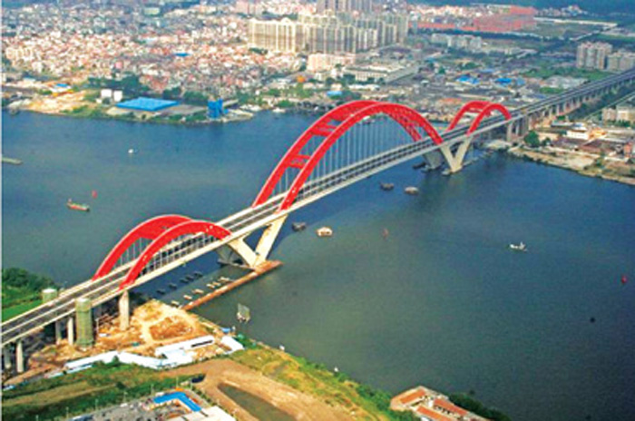 廣州新光大橋是世界上第一座由鋼桁拱與V型剛構(gòu)組合而成的飛雁式三跨中承式拱橋,主橋為177+428+177m的三跨連續(xù)剛構(gòu)鋼桁拱橋。主、邊拱拱肋采用五大段提升法施工,其中邊拱為原位拼裝、垂直提升,主拱為碼頭拼裝、滑移上船、浮運就位、垂直提升,創(chuàng)造了我國橋梁施工整體提升重量及高度的最高紀錄(2600t,約96m),在世界橋梁施工中名列前茅。