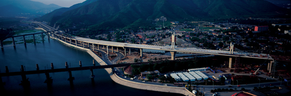 豐沙鐵路轉(zhuǎn)體斜拉橋位于北京市門(mén)頭溝區(qū)三家店村,是西六環(huán)項(xiàng)目建設(shè)中科技含量最高、施工工藝最為復(fù)雜、工期最為緊張的控制性工程, 主橋設(shè)計(jì)為56 +100 +70 +37米四跨連續(xù)雙圓柱子母塔單索面W形腹板截面預(yù)應(yīng)力混凝土曲線斜拉橋,橋梁全寬30.5米。結(jié)合本橋橋墩較高、體量較大的實(shí)際情況,因地制宜地采用了墩頂大噸位單鉸轉(zhuǎn)體施工工藝,主要技術(shù)指標(biāo)為:墩高21.5米,轉(zhuǎn)體總長(zhǎng)182米,平曲線半徑950米,單鉸轉(zhuǎn)體重量15000噸,轉(zhuǎn)體角度40度,是我國(guó)第一座采用墩頂轉(zhuǎn)體施工的橋梁,是世界上墩頂單鉸轉(zhuǎn)體噸位最大的橋梁。