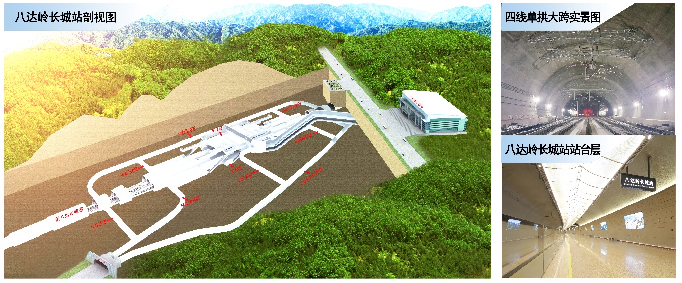 八達(dá)嶺長城隧道地處八達(dá)嶺核心風(fēng)景區(qū),全長12公里。八達(dá)嶺長城站設(shè)在新八達(dá)嶺隧道內(nèi),車站為三層三縱結(jié)構(gòu)的復(fù)雜洞室群地下車站,相鄰洞室最小水平間距2.2米、最小垂直間距4.5米,最大埋深102米,站隧過渡段為超大跨結(jié)構(gòu),最大跨度32.7米,地下部分建筑面積4萬平方米。中鐵設(shè)計(jì)研發(fā)了超大跨松散圍巖隧道修建技術(shù),解決了深埋地下站防災(zāi)救援疏散、舒適環(huán)境構(gòu)建、小凈距洞群穩(wěn)定及超長耐久性等系列難題,實(shí)現(xiàn)了世界上埋深最深、規(guī)模最大的全暗挖站隧一體高鐵車站。
