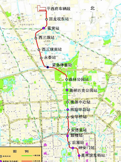 線路全長(zhǎng)38.908km,其中一期工程(奧運(yùn)支線)(森林公園站-熊貓環(huán)島站)4.528km,二期工程(回龍觀東站—森林公園站、熊貓環(huán)島站—美術(shù)館東街站)17.303km,遠(yuǎn)期工程(地安門—五福堂)17.077km,全部為地下線;全線設(shè)車站29座,其中一期工程4座,二期工程11座,遠(yuǎn)期工程14座,全部為地下站。全線在平西府設(shè)車輛段一處,在大紅門設(shè)停車場(chǎng)一處。